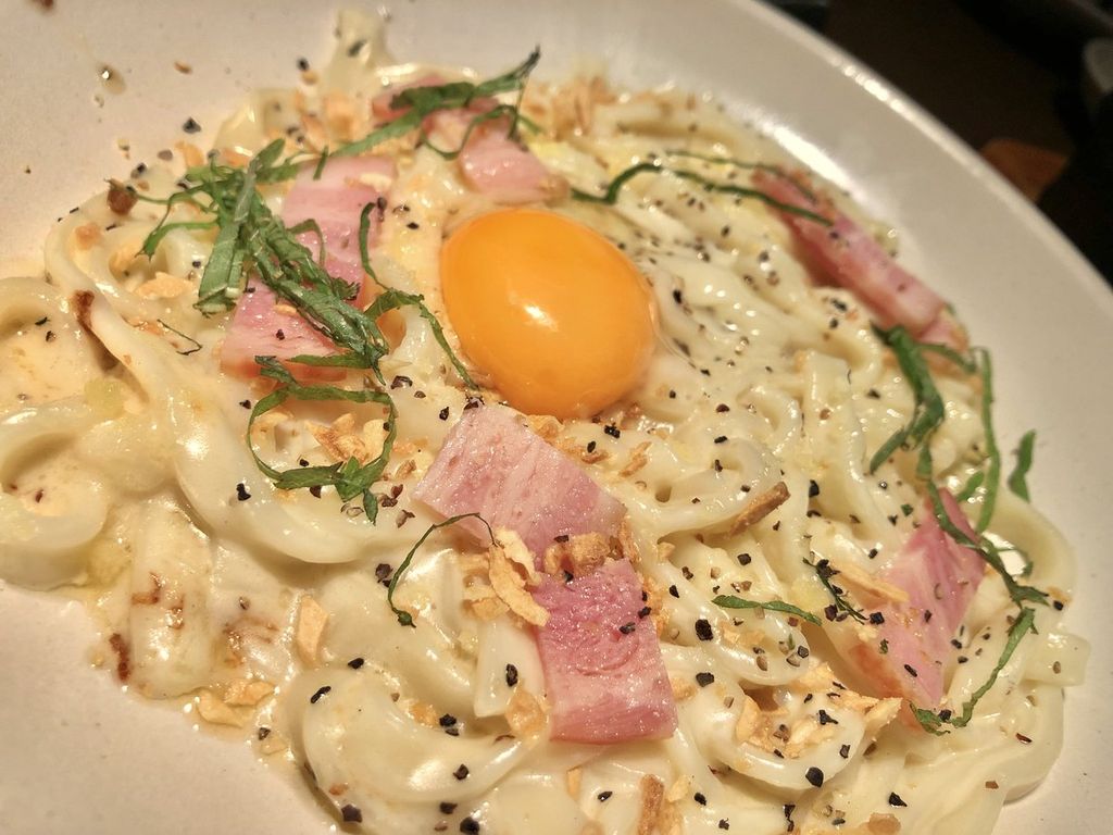 お店の定番カルボナーラきしめんがすごくモチモチで美味しかった??